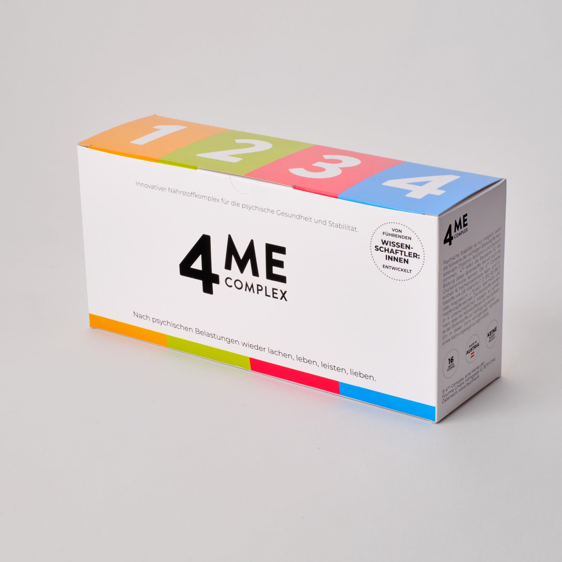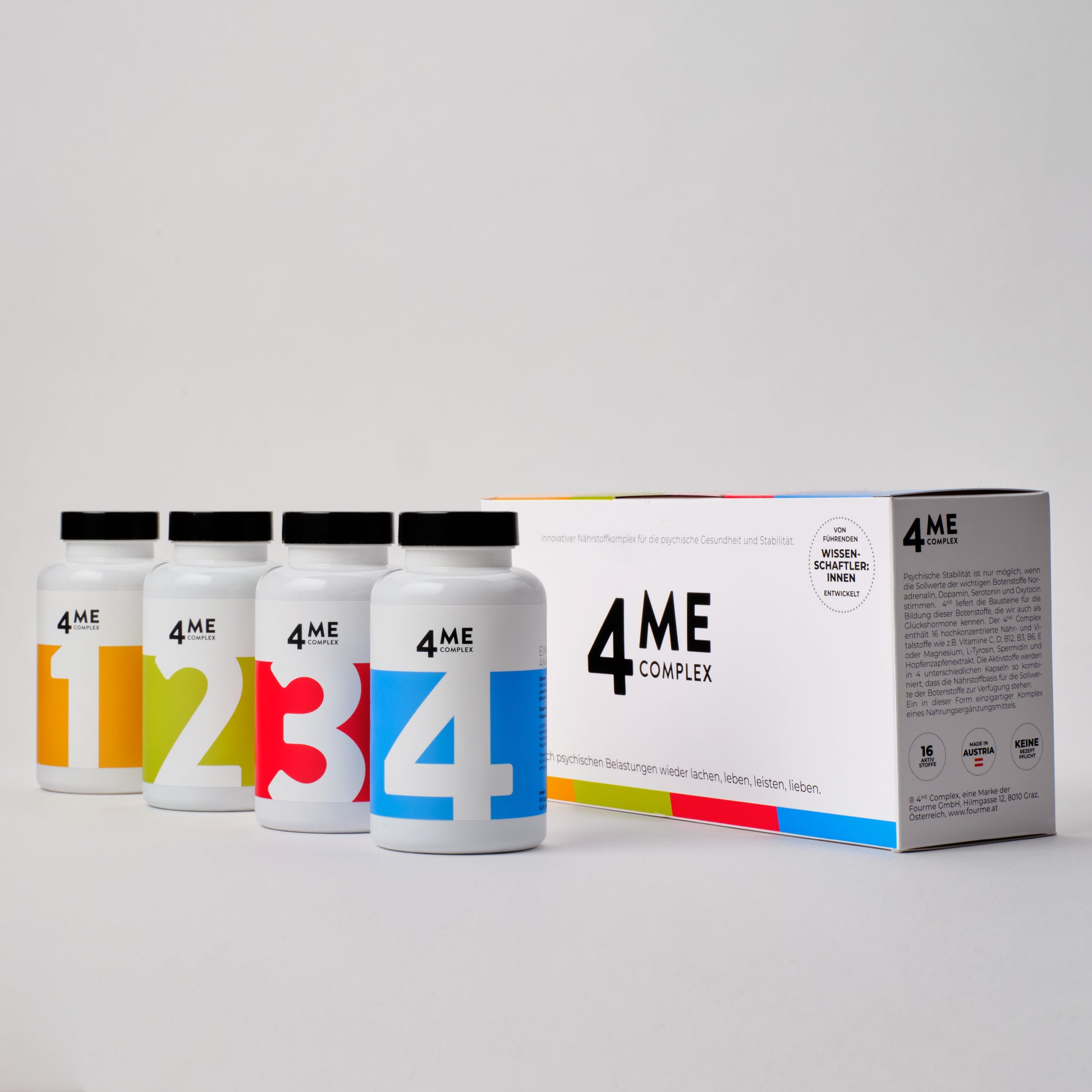 Gemeinsam mit Expert:innen aus dem Bereich Biochemie haben Dr. Ursula Grohs und Ihre Tochter Mag. Susanne Schlager-Grohs, auf Basis weitreichender Erfahrungen in der psychodynamischen Psychologie und Ernährungspsychologie, den 4ME COMPLEX entwickelt. Mehr als 6 Jahre wurden aufgewendet, um zielführende Kombinationen von Aktivstoffen zu prüfen und zu testen. Mit dem 4ME COMPLEX gelingt es, wieder zu psychischer Stabilität zu finden.